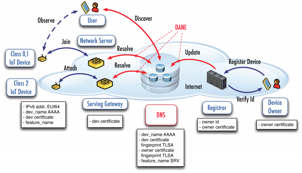 We will apply the PKI framework to roaming IoT devices—we propose to explore the idea of IoTRoam, a federation of DNS servers for IoT similar to EduRoam (the network that enables authentication of users in university Wi-Fi hotspots). An IoT device can be authenticated in networks belonging to different operators or owners based on its name. This type of an open federated infrastructure is useful for research and public IoT networks. It will enable seamless roaming of IoT devices between multiple IoT networks. We propose to study this implementation initially on LoRa networks based on DNS and OpenID, OAuth 2.0, and the Authentication and Authorization for Constrained Environments (ACE) framework. The framework will include recent advances in DNS privacy to limit the scope of the name resolution to some well-defined actors and consider randomized low-level identifiers to avoid tracking personal information.
